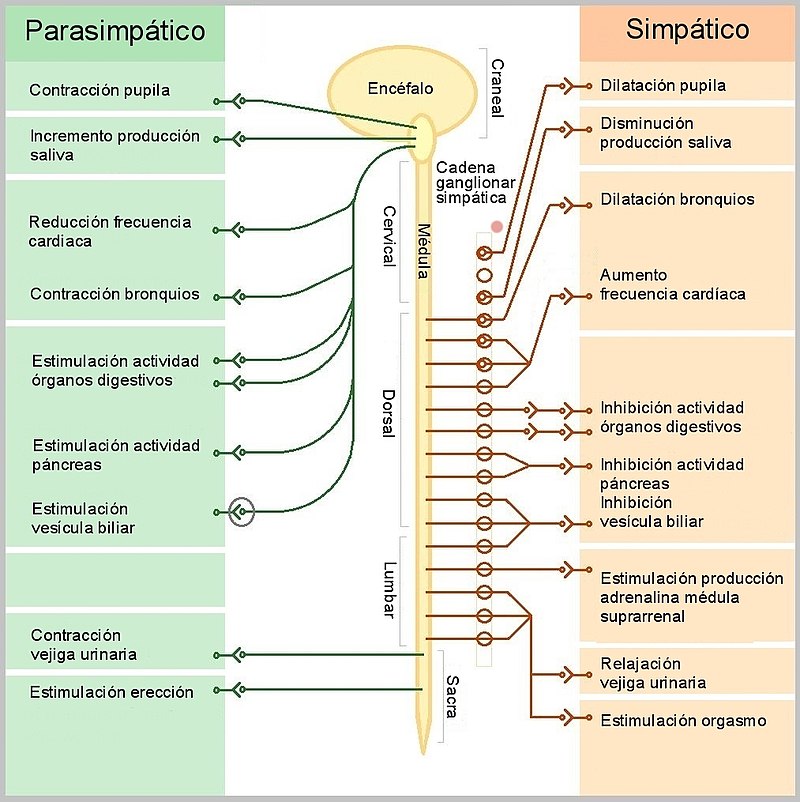 - El sistema nervioso parasimpatico: El principal neurotransmisor de este sistema es la acetilcolina. Está integrado por varios nervios que nacen del encéfalo y otros que surgen de la médula espinal a nivel de las raíces sacras S2 a S4. En muchos órganos su acción es opuesta a la del sistema nervioso simpático. Regula de forma involuntaria numerosas acciones tales como :