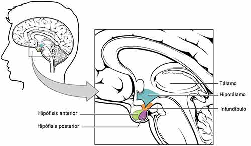 - Hipotálamo: Es un centro de control del sistema endocrino. Está conectado directamente con la hipófisis o glándula pituitaria. Segrega dos hormonas que se almacenan en la neurohipófisis: la vasopresina (hormona antidiurética o ADH que aumenta la reabsorción de agua en los riñones) y la oxitocina (provoca la liberación de leche durante la lactancia) A su vez el hipotálamo produce factores de liberación hipotalámicos. Se trata de hormonas que actúan sobre la adenohipófisis y estimulan o inhiben la secreción de las hormonas hipofisarias: la corticotropina (ACTH estimula las glandulas suprarrenales), las gonadotropinas (FSH y LH, estimulan la ovulación y la generación de testosterona en el hombre), tirotropina (TSH estimula la producción de tirosina en la glándula tiroides) y la hormona del crecimiento GH. El hipotálamo interviene en la regulación de la temperatura, la sed y el hambre así como en el control de los ritmos circadianos (ciclos de sueño y vigilia) A su vez forma parte del sistema límbico que es el centro regulador de las emociones. Alrededor del hipotálamo se encuentran el quiasma óptico (Par 2 nervio óptico), el tuber cinereum (libera histamina que ayuda al control del ritmo circadiano) y los cuerpos mamilares (sistema limbico; reciben impulsos nerviosos procedentes de la amígdala y el hipocampo)