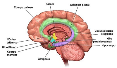 El sistema límbico se encuentra en el borde o límite de la corteza cerebral (en latín limbus=límite) Se encarga básicamente de generar y regular emociones. Se encuentra involucrado en la formación y regulación de emociones así como en los procesos de conducta, aprendizaje y memoria. Está compuesto por las siguientes estructuras: