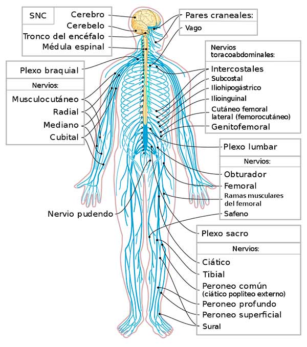 - Nervios Espinales: Son 31 pares que se conducen por la Médula Espinal. Se encargan de enviar información sensorial (tacto, dolor, temperatura), de la posición, del estado de músculos y articulaciones desde el tronco y las extremidades hacia el sistema nervioso central. Desde el sistema nervioso central reciben órdenes motoras para el control de la musculatura esquelética.