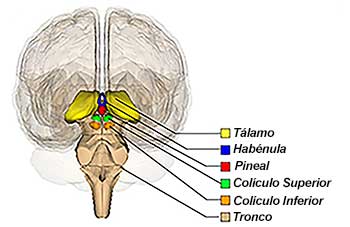 - Epitálamo. Contiene la glándula pineal. La glándula pineal sintetiza la hormona melatonina a partir de la serotonina durante la noche en ausencia de luz. Está relacionada con el núcleo supraquiasmático del hipotálamo que es el que recibe información de la luz a través de la retina. Al núcleo supraquiasmático se considera nuestro reloj biológico, algo que tiene mucha importancia en nuestra salud ya que las hormonas se van liberando en función de nuestro reloj biológico y aseguran el buen funcionamiento de los órganos. Por la mañana se libera cortisol para activarnos y por la noche melatonina para favorecer el sueño.
